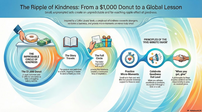 The story was heartwarming to me and in line with my continual efforts regarding "Excellence and kindness. Live it. See it. Celebrate it." I sent a handwritten note to Emilie Smith, the bakery owner, thanking her for sharing that story with the world. I closed with "Kindness rules... and we need to celebrate this more loudly." I also enclosed ten dollars and asked that the bakery provide a random customer (or two) with free coffee and a donut. A micro-moment that I know can ripple the kindness forward.