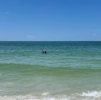 Once we had our fill of the cute marine life, Dan took us to a cove on North Captiva Island. We disembarked with food, towels, an umbrella, and other gear and walked through the mangroves for about 75 yards until we got to the Gulf with its crystal blue waters with very warm water - it had to be close to about 85 degrees Fahrenheit. We swam in the warm ocean for a couple of hours. The white sand, blue skies, turquoise warm waters of the Gulf, mom/daughter fun, and rekindled friendships made today perfect.