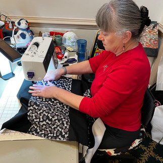 Linda also created smaller bags (no photos on them) and worked on a Christmas Ornament from https://theornamentgirl.com/. She plans to finish the ornament at home (lots of pins are needed - but in the kit!).